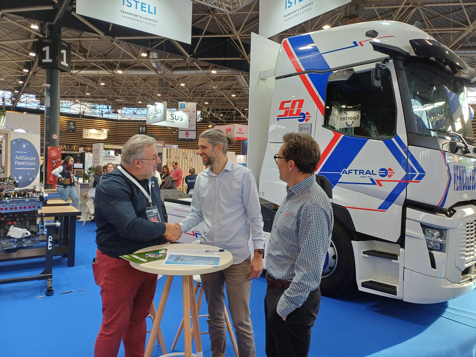 Trois hommes posent ensemble, souriants, près d'un stand lors d'un événement, avec un document sur une table entre eux.